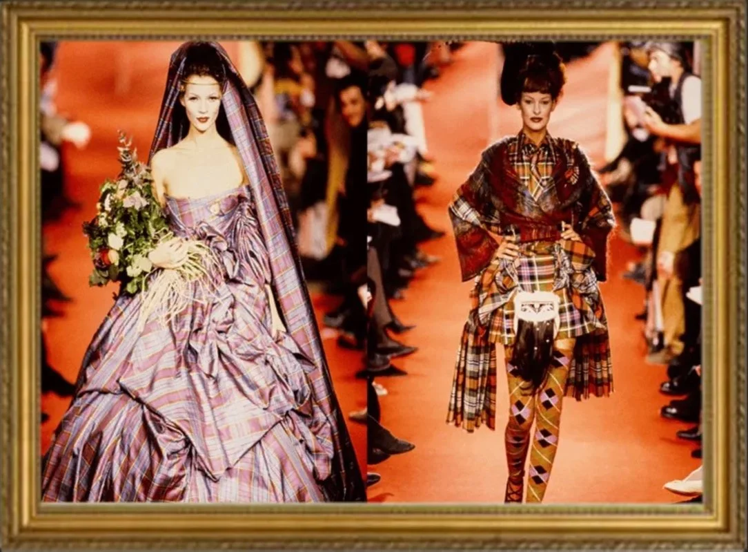 The starting look of the “Anglomania” runway show, which is seen in figure one and is worn by Simonetta Gianfelici, expresses a regal woman who is dressed in a flamboyant coat that is made from chinchilla inspired fur. The coat is draped over a plaid tailored matching set with a pair of “Rocking Horse” platforms. The embellished, multilayered necklaces complete the rich look. This abundance of jewelry further emphasizes the theme of luxury that usually comes with a higher social status, which can speak to Westwood’s distaste for capitalism and the unnecessary importance that comes with having a high social rank. Another detail that reinforces the French stylistic choices, is how the shopping bag that the model is carrying contains a French baguette. The addition of a French baguette is a straightforward nod to the French incorporation that is weaved throughout these looks, and it is an object that is so specifically deemed as “French” that everyone will understand. From this bag Gianfelici takes an orb that holds a watch, that she then wraps around her wrist. This orb watch was a collaboration between Westwood and the international mainstream brand known as Swatch in the year 1992. This collection was led by the British poster girl at the time, Kate Moss. Her most notorious look from this runway, as seen in figure two, was a silky head veil and a gown that had a traditional wedding dress silhouette. The veil had a delicate, yet luxurious gold chain that wrapped around Moss’s forehead. The gown required the iconic English crinoline underneath in order to make the bottom half of the dress more pronounced and dramatic. The long, puffed sleeves were also a staple in the subtle regal theme that was showcased in the “Anglomania” line. These two classic pieces were covered in a matching burnt orange, gray blue, light chartreuse, and lilac plaid pattern. This look was complimented by a grand bouquet of flowers and an assortment of straw, while also bearing the signature Westwood orb logo in the corner top half of the dress.
